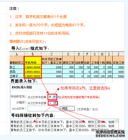 工資條短信是個性化變量短信中的一種,使用巨象企信通平臺的訂制短信功能可以一次性批量群發(fā)各類變量短信,即一次批量群發(fā)的手機號碼收到的內(nèi)容不完全一樣,如內(nèi)容里加入稱呼、工資條、物業(yè)費、賽事編號、座位號、學(xué)號等。有三種個性化變量短信提交方法,用戶可根據(jù)您自身資料格式選擇其中一種。