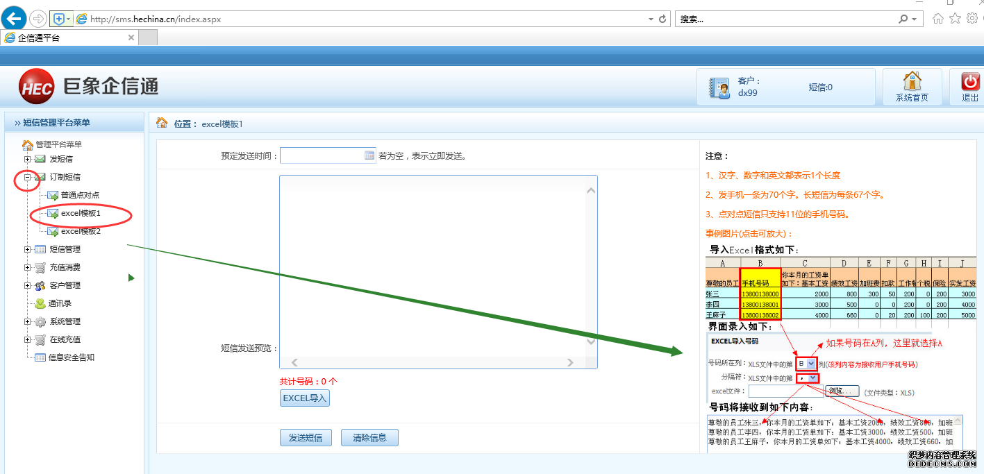 二、注冊開通賬號后登錄平臺,點擊左側(cè)導(dǎo)航條的訂制短信,如下圖所示選擇模版1即可進行工資條短信批量發(fā)送。