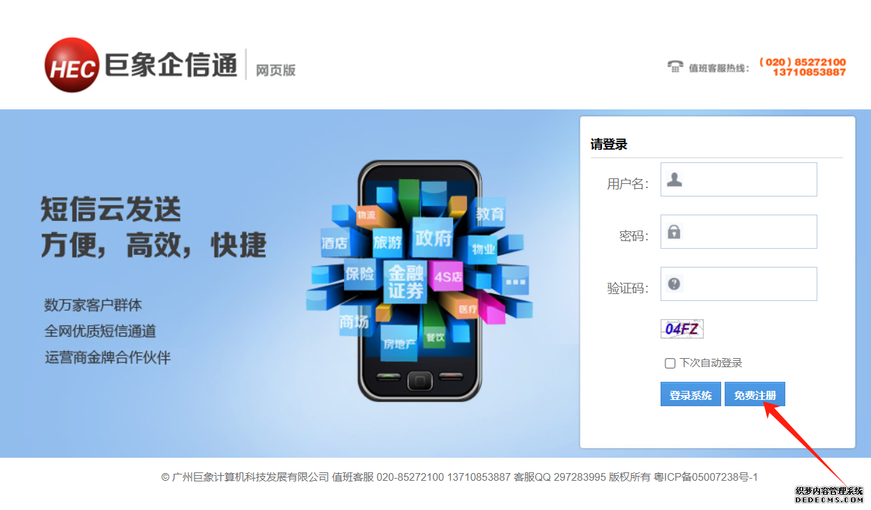 一、發(fā)送招工短信、招聘短信,首先用電腦或手機登錄巨象短信群發(fā)平臺首頁