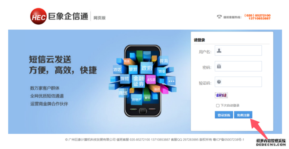 用電腦或手機(jī)登錄短信平臺軟件首頁https://sms.hechina.cn點擊免費注冊 ,如下圖所示。用戶名可以是手機(jī)號碼、公司簡稱的中文或拼音。